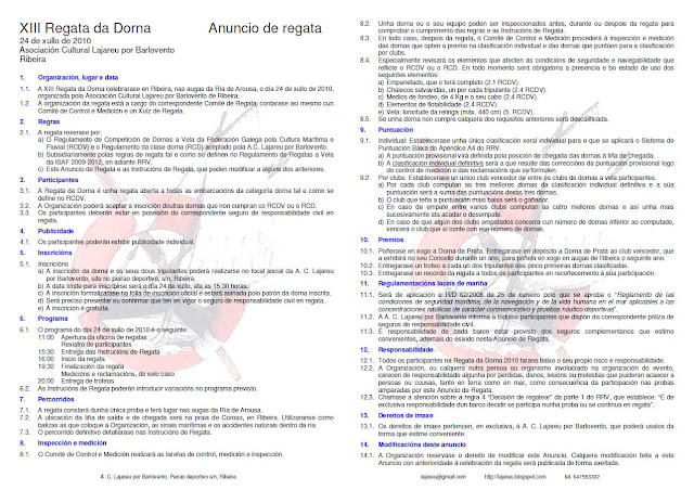 O paso das dornas de Lajareu poderá seguirse na mañá do sábado 30 de xulio dende Castiñeiras, Aguiño, Espiñeirido, Corrubedo, Baroña, O Son e Monte Louro, rematantodo sobre as 15:00 horas, coa vistosa arribada ao rio en Abelleira, que esperamos poder facer a vela, en plena celebración da festa Abelleira Mariñeira,e acompañados polas demáis embarcacións que acodan ao vento, entre as que destacarán sen dúbida os Currachs irlandeses de Cork.